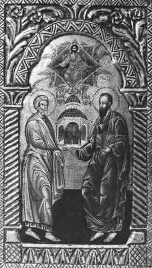 (Táto ikona predstavuje na ľavej strane Svätého Petra a na pravej strane Svätého Pavla. Oni, ako dva stĺpy, spoločne držia Cirkev. Vo vnútri je Pokrm: Svätá Eucharistia (v mojom videní Rieka Života). Nad tým je Kristus, Veľkňaz a Hlava Cirkvi.)